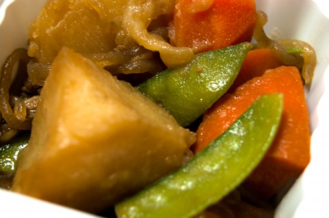 1.鍋に油を少々を入れ、肉を少し炒め、その中にじゃがいも、玉ねぎを入れて、さらに炒め、砂糖と醤油、酒、水を入れて30分くらい煮込む。